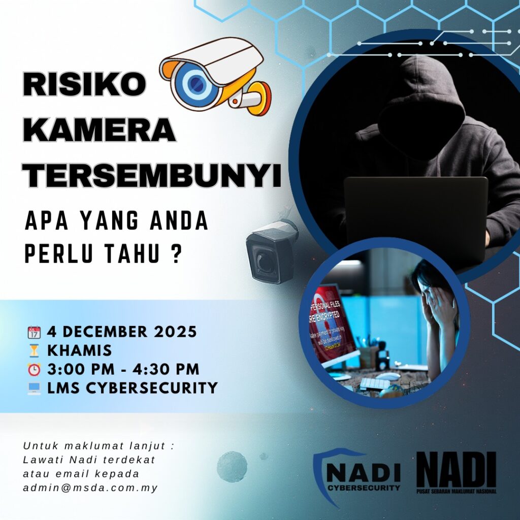 βDalam webinar ini, peserta akan mempelajari cara mengenal pasti kewujudan kamera tersembunyi, memahami risiko keselamatan dan privasi yang berkaitan, serta mengetahui langkah pencegahan dan tindakan yang boleh diambil untuk melindungi diri daripada pemantauan tanpa kebenaran.β